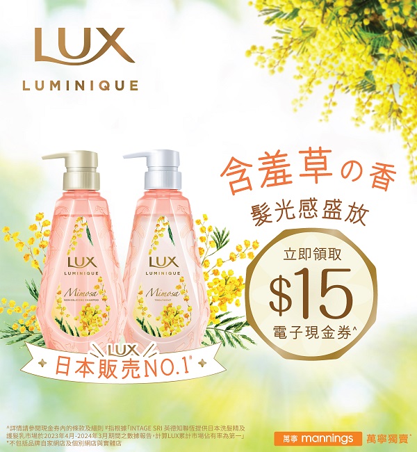 於有效日期內購買LUX LUMINIQUE洗護髮系列(包括洗頭水/ 護髮素/ 洗護套裝),可作$15使用