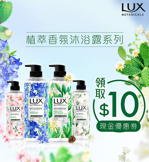 購買任何LUX Botanicals植萃香氛沐浴露系列產品,可於限定時間內作HK$10使用