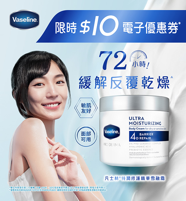 購買凡士林®特潤修護精華雪融霜系列,可於指定時間內作HK$10使用。